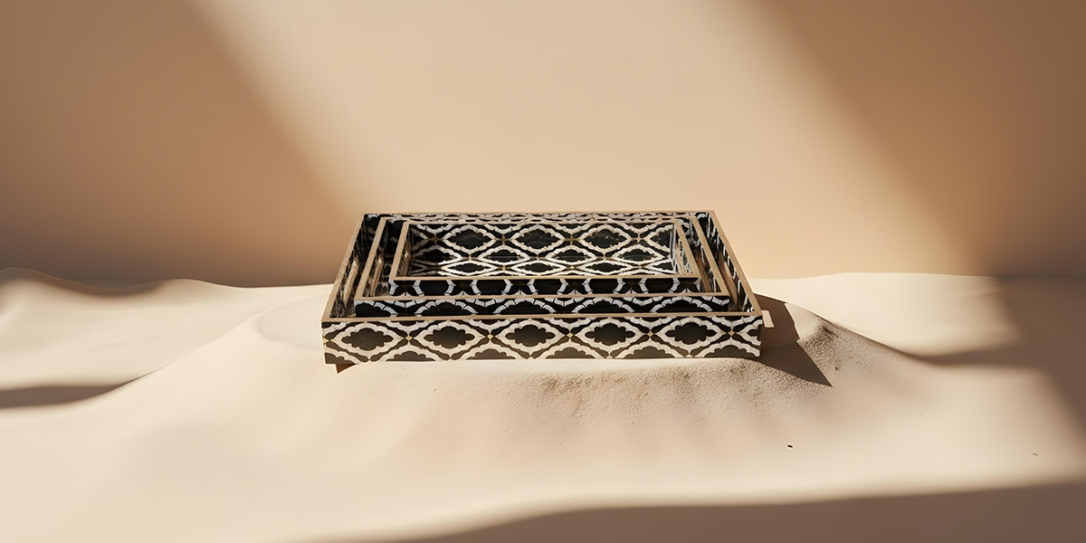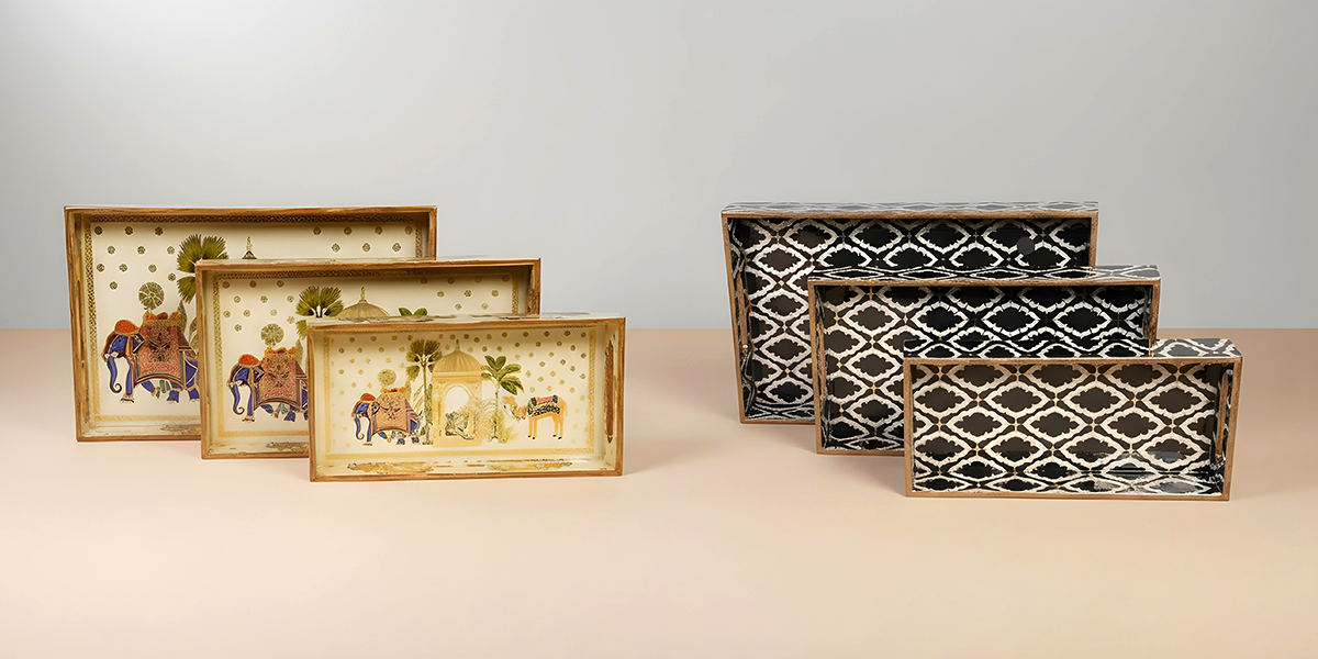 Premium Wooden Tray Set of 3 with 6 Coasters | Large, Medium & Small Sizes for Serving, Dining & Decor
