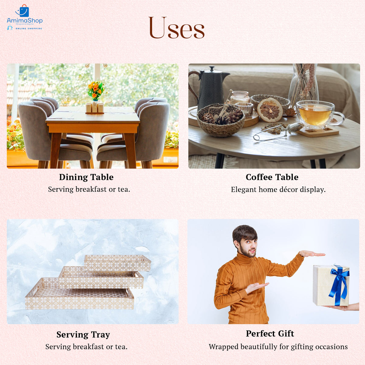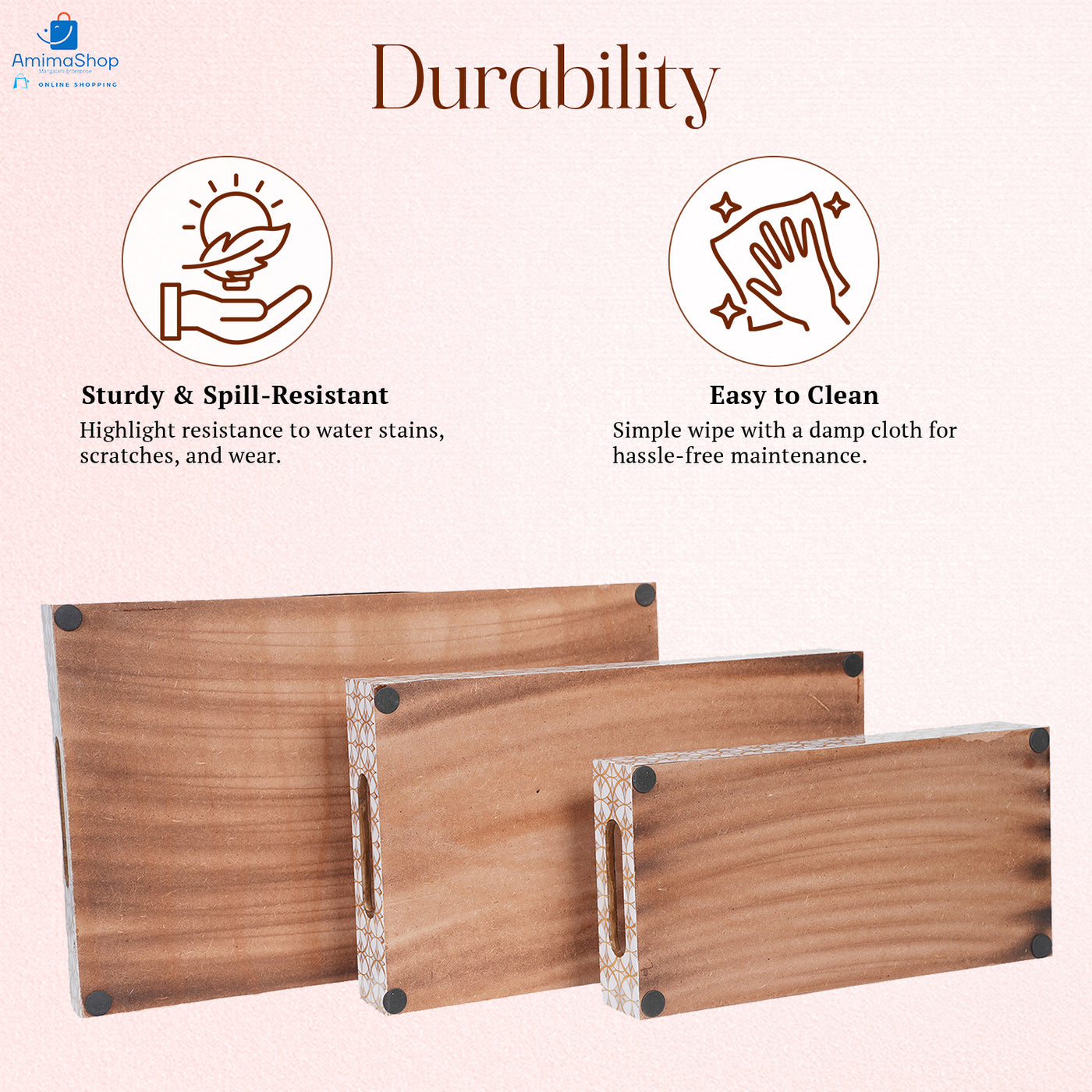 Amimashop® Gold Design Set of 3 Rectangular Wooden Serving Trays 16", 14", 12"