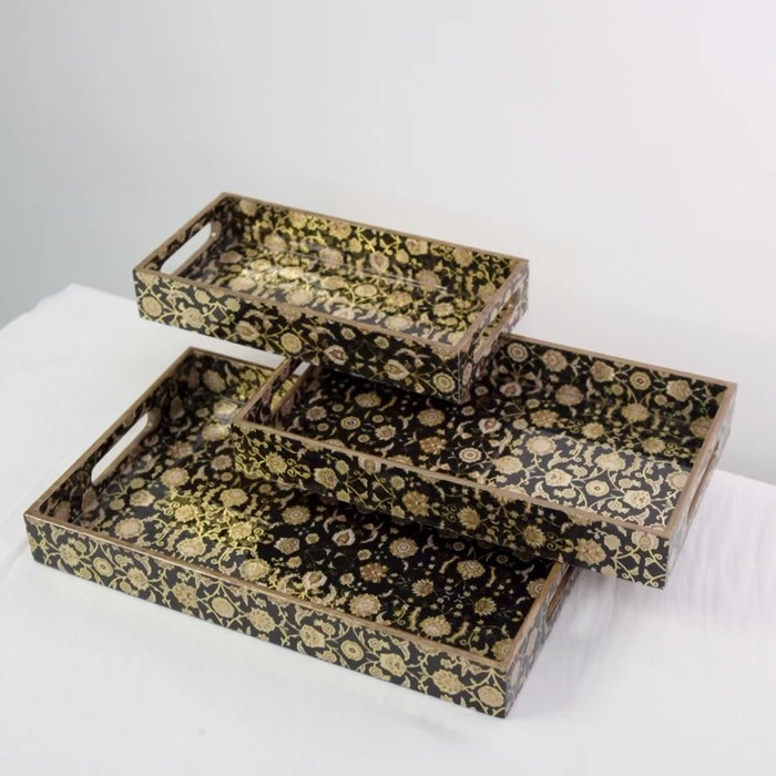 Each set includes three premium wooden trays (16″, 14″, and 12″) in a rich black finish with gold accents, creating a striking contrast that complements both modern and traditional interiors. The handcrafted gold engravings add an artisanal touch, making these trays stand out as both practical tools and decorative pieces.