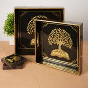 Black Set of 2 Wooden Serving Trays with Coasters 12"& 14"