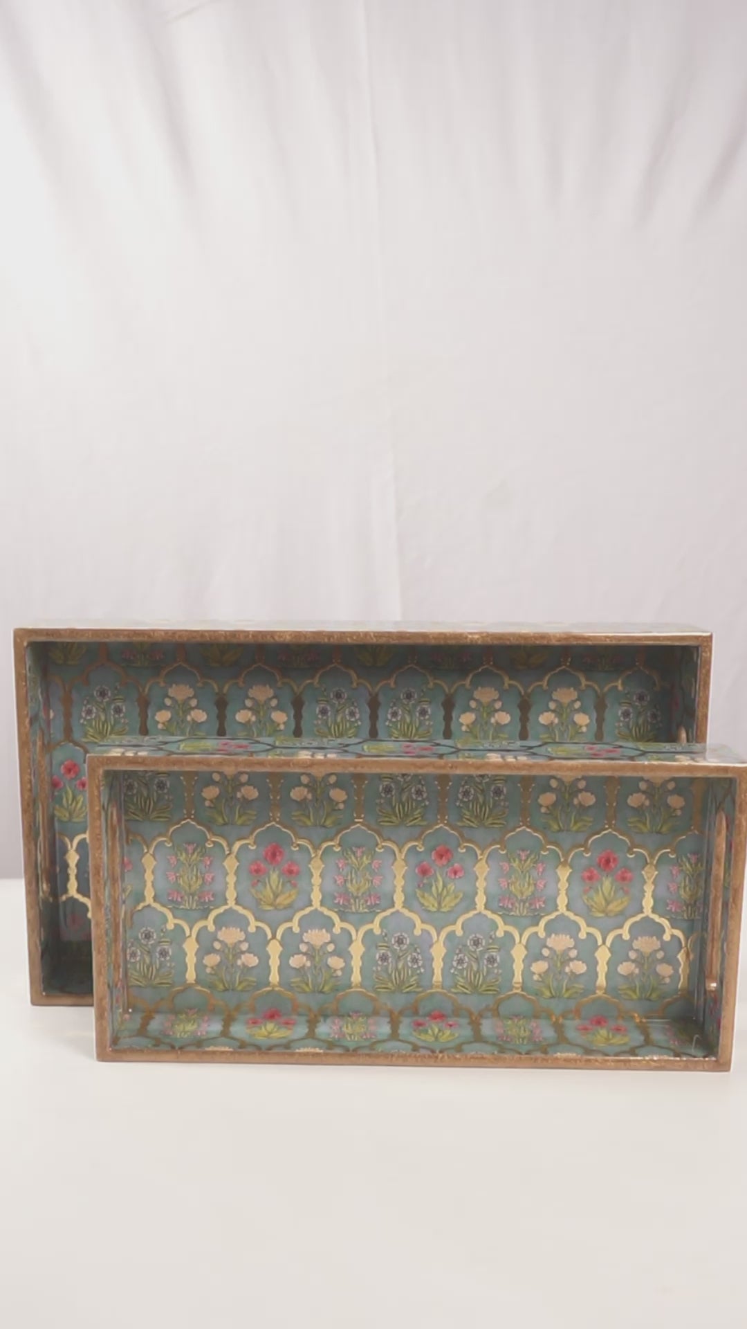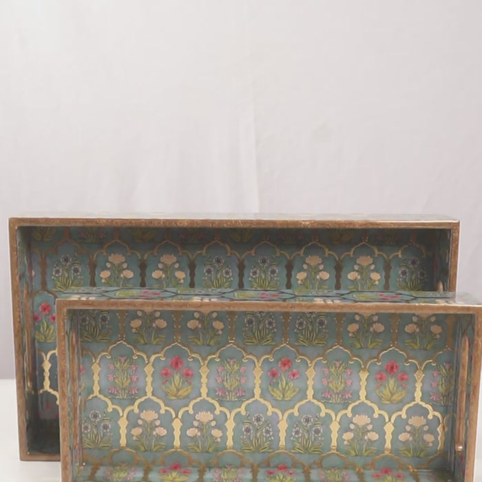 Green Flower Set of 2 Wooden Serving Trays (12" & 14") | Premium Rectangular Mango Wood Trays for Kitchen, Dining, Tea/Coffee & Breakfast | Handcrafted Decorative Wooden Tray Set for Home & Gifts