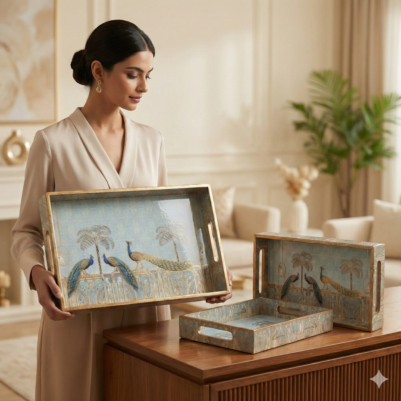 Elegant PEACOCK Design: Stylish peacock patterned wooden tray set that adds a touch of sophistication to your kitchen and dining...