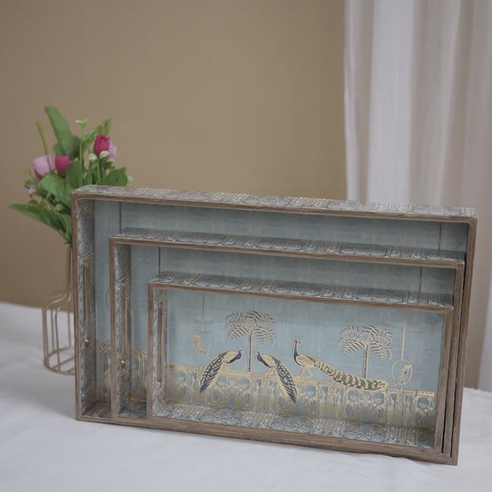 Amimashop® Peacock Set of 3 Rectangular Wooden Serving Trays 16", 14", 12"