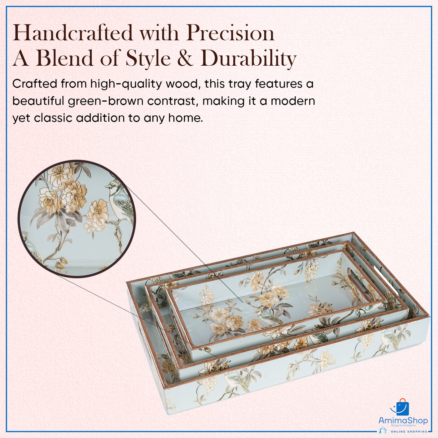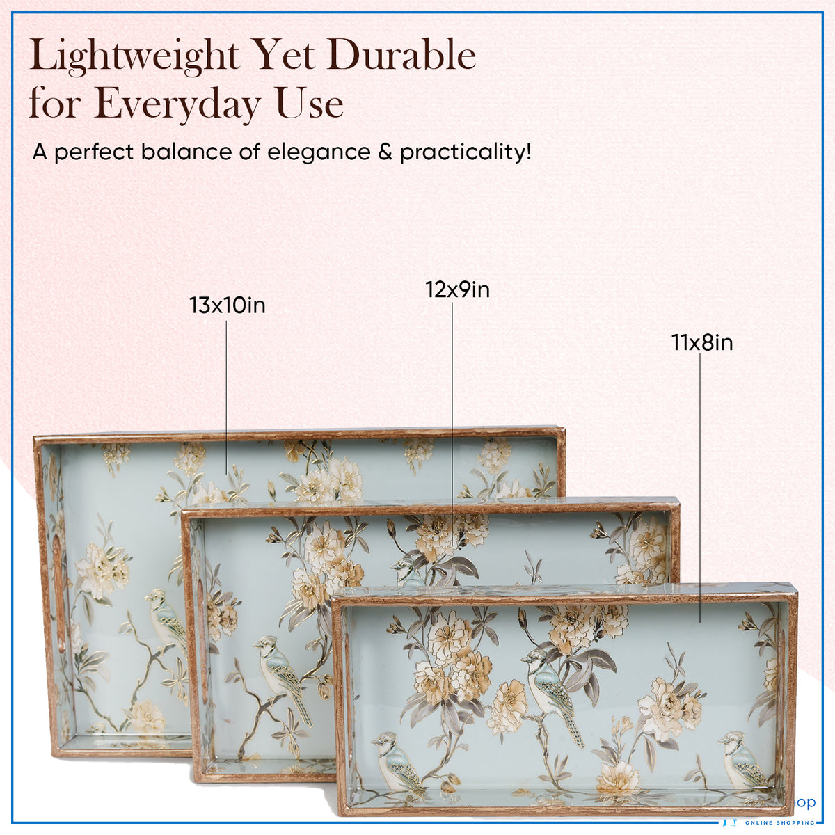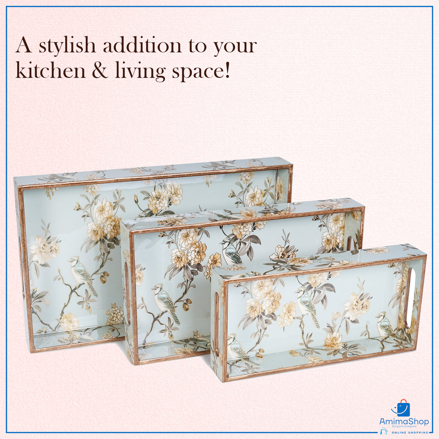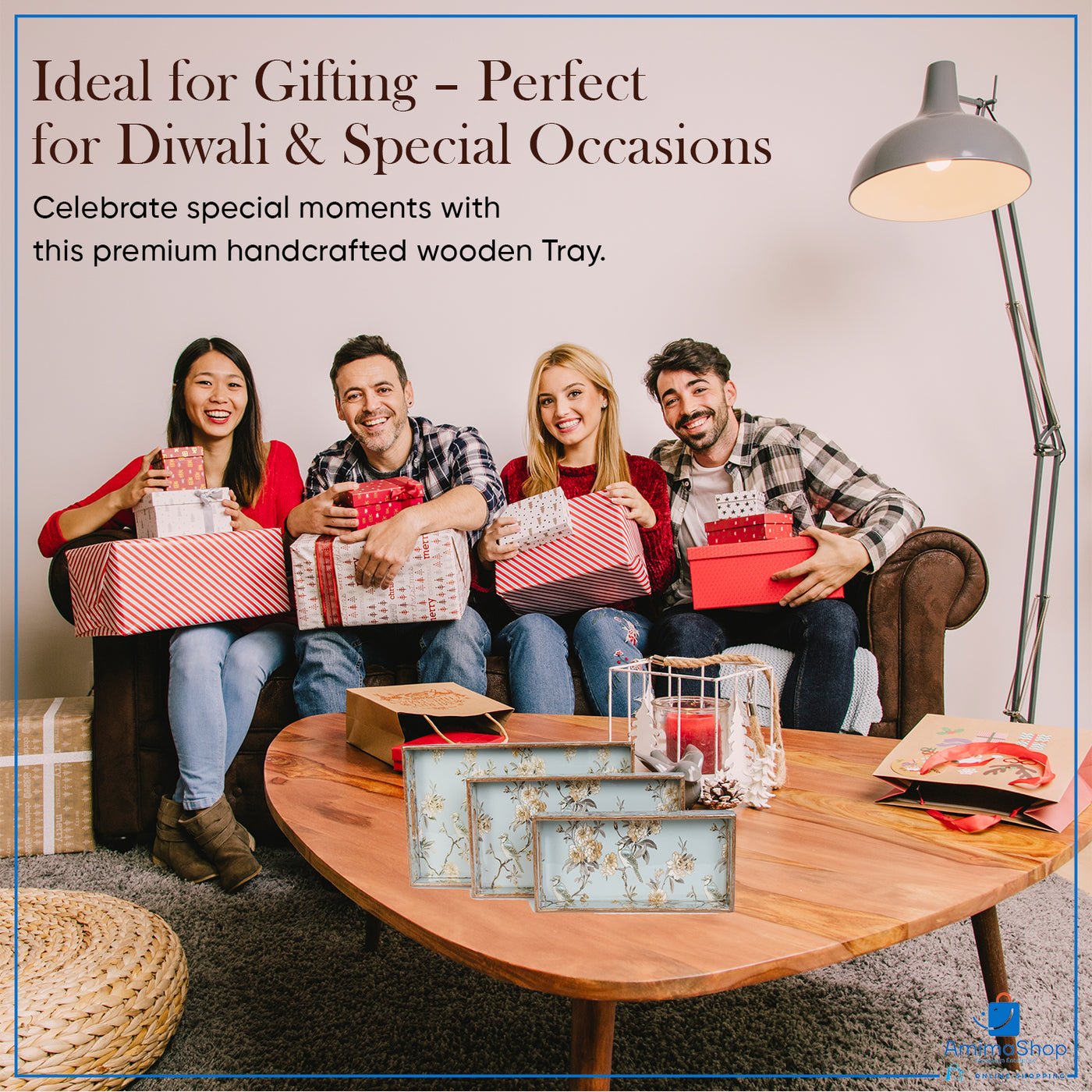 Each set includes three premium wooden trays (16″, 14″, and 12″) in a vibrant blue base with gold elephant motifs, creating a cheerful yet sophisticated accent for your home. The hand-painted gold engravings showcase intricate elephant patterns that tell a story of wanderlust and exotic elegance.